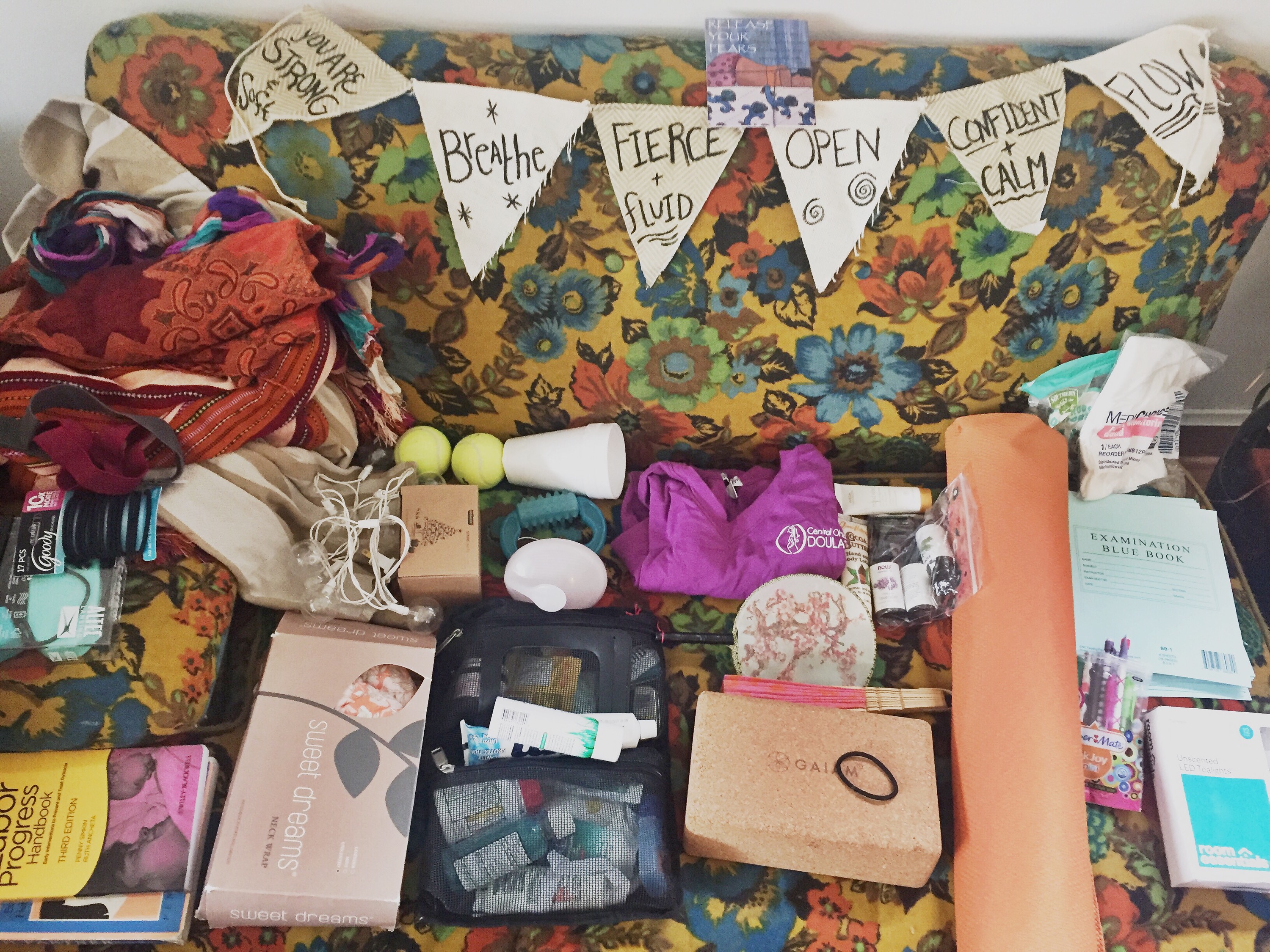 Not pictured: coconut water, chocolate, all my snacks, my peanut ball and my super nice and comfy body pillow that I pull out for clients facing a long induction.